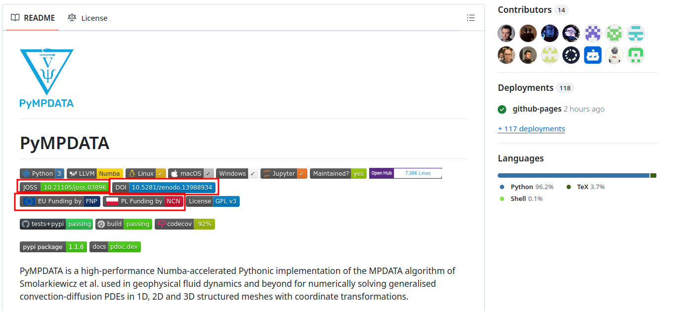 La página de descripción del repositorio en GitHub exhibe, entre otras etiquetas, el DOI para esa versión en particular, el DOI al artículo científico publicado en el JOSS explicando este software, así como otras etiquetas para atribución de las fuentes de financiación del proyecto.