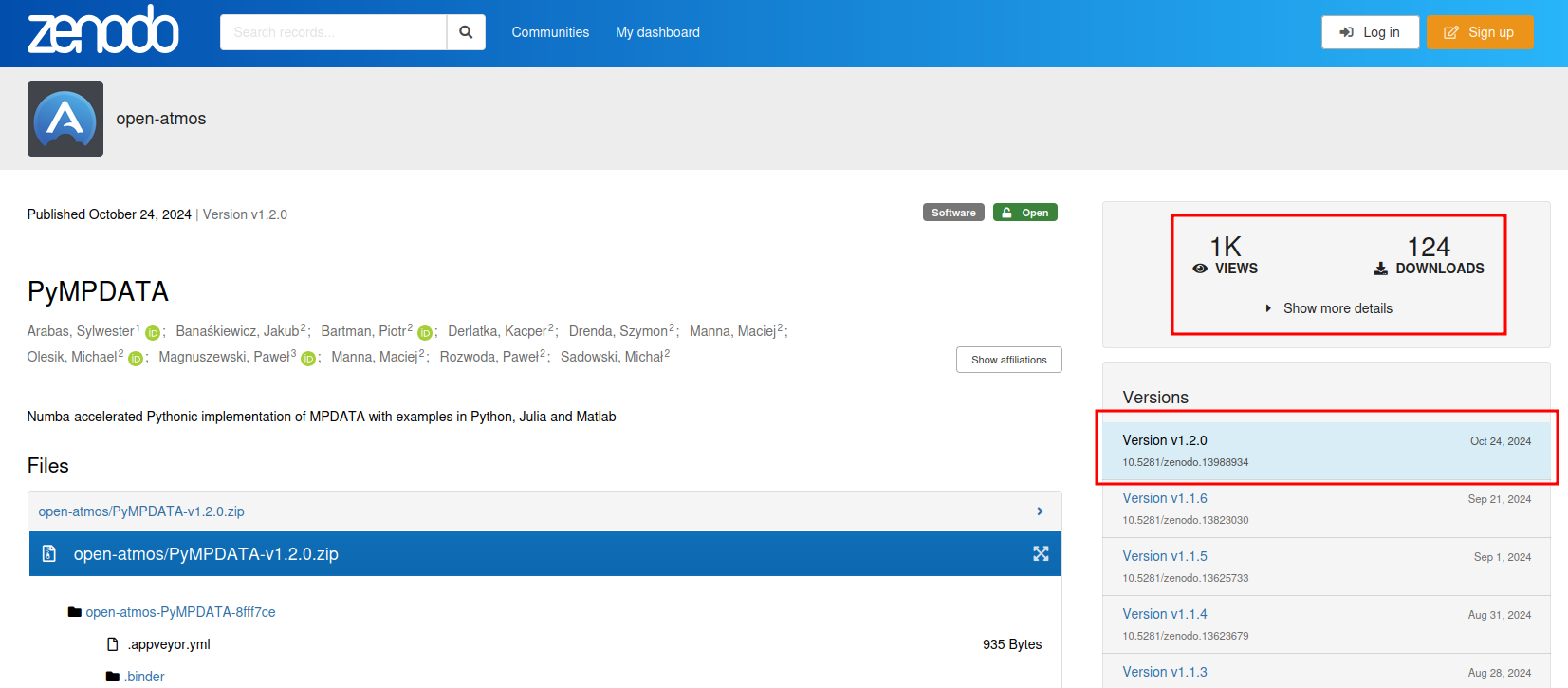 Como ejemplo, la Figura 8.1 muestra la página de Zenodo correspondiente al software PyMPDATA, que apunta al repositorio original del software alojado en GitHub, mostrado a su vez en la Figura 8.2. Podemos ver las referencias cruzadas de metadatos que mantienen la coherencia de conexión en ambos sentidos.